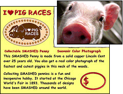Do you have souvenirs for your 2008 Pig Racing season? No one can resist purchasing a souvenir photo of the cutest pigs and a collectable SMASHED penny right after watching your pig race show.